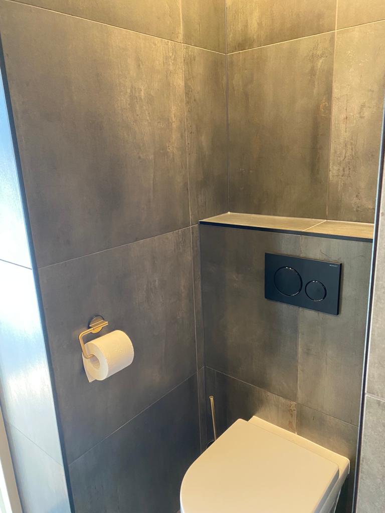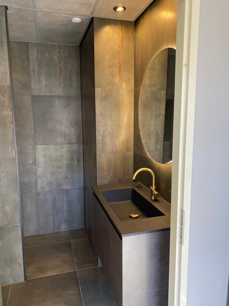 In de hal bevindt zich de badkamer, met daarin een inloopdouche, toilet en wastafel.