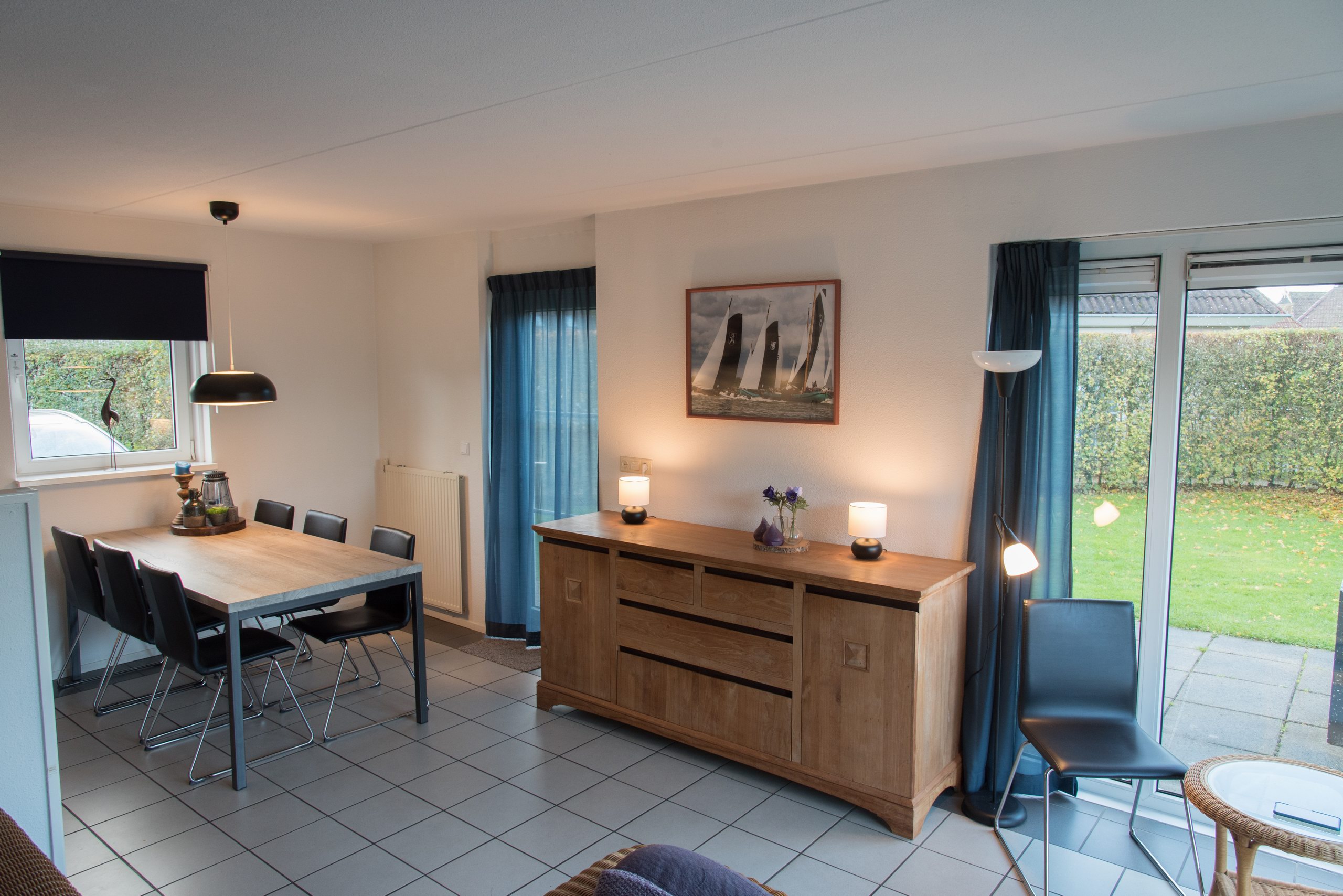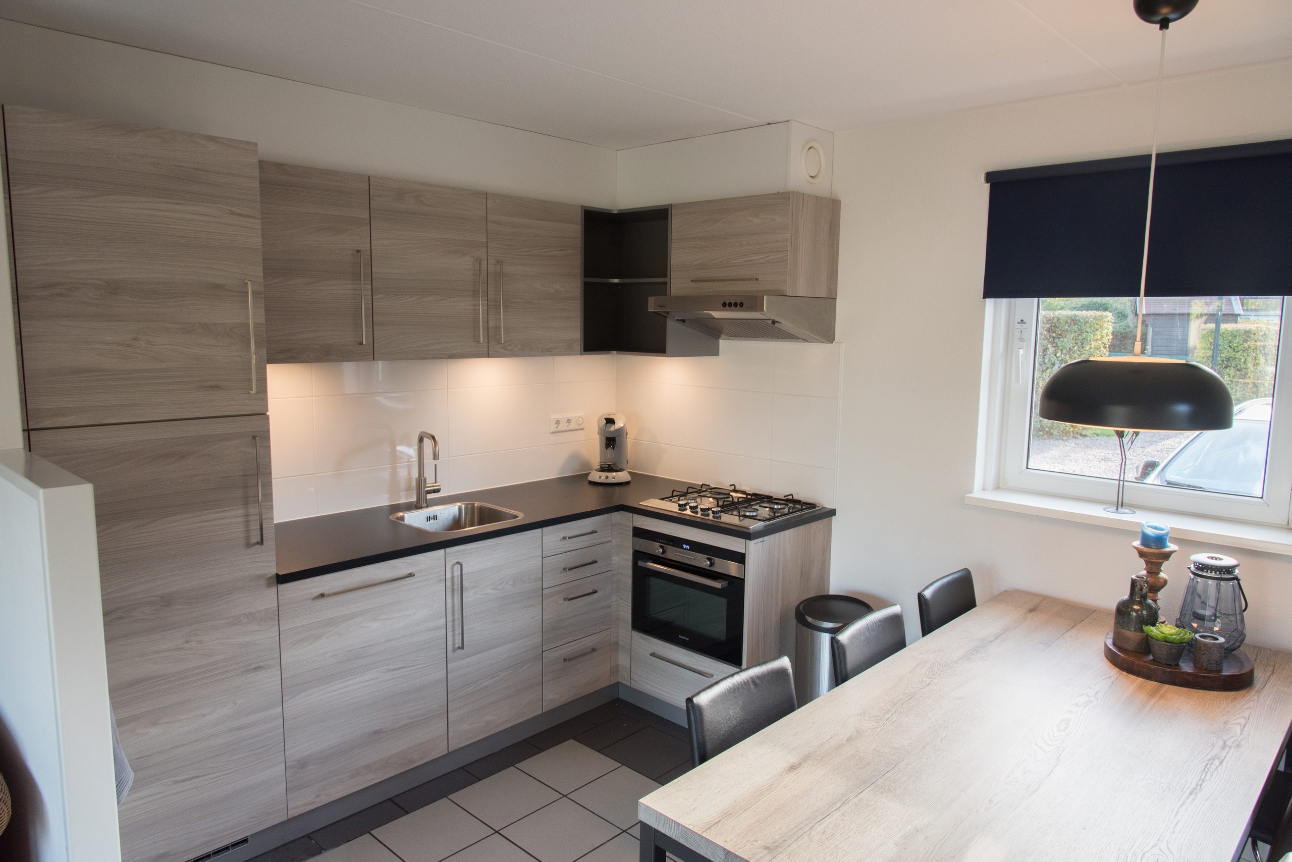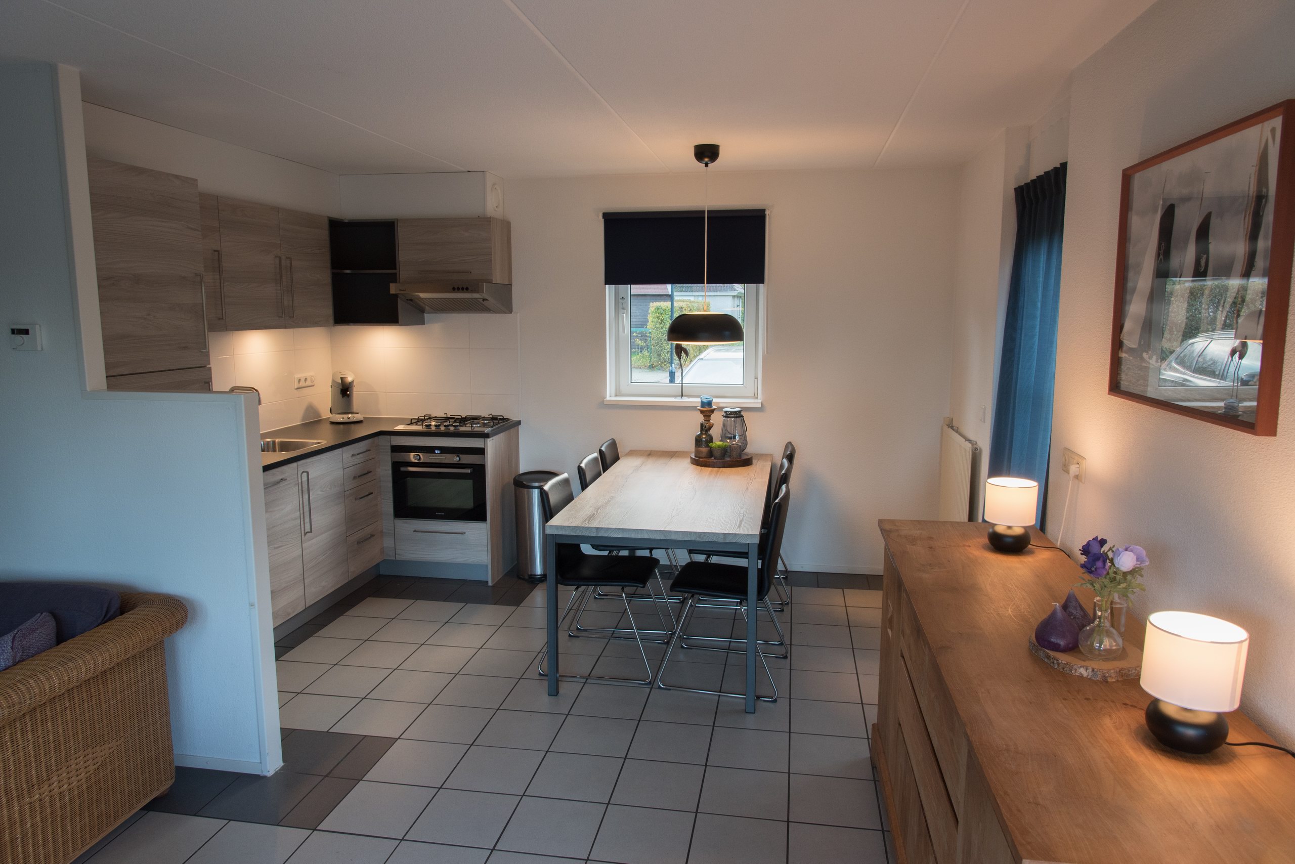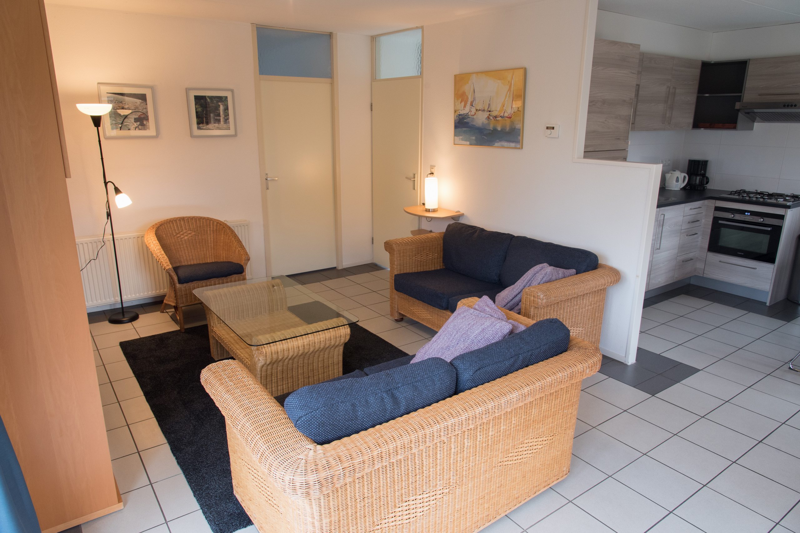 Ook bevindt in dezelfde ruimte een open keuken, waar u gezellig kunt dineren. De keuken is voorzien van een koffiezet apparaat, waterkoker, vaatwasser, combi magnetron en een koelkast met vriesvak.